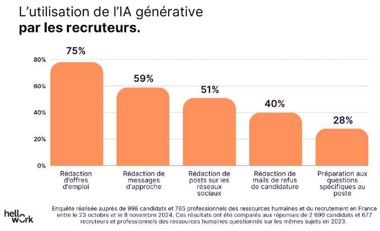 Ces résultats ne sont pas très étonnants. L’IA est utilisée pour la partie bullshit job du travail des recruteurs, répétitive, avec peu de valeur ajoutée. Côté candidats, l’IA apporte une aide qualitative liée à la production de contenu, premier usage grand public de l’IA.